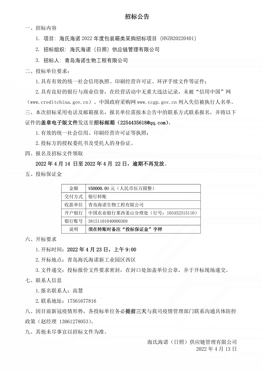 2022年度海氏海諾集團包裝箱類采購招標公告