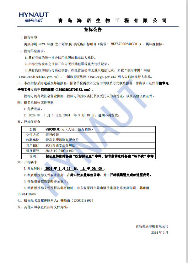 2024年度美康印刷空白紙鋁膜采購招標項目招標公告